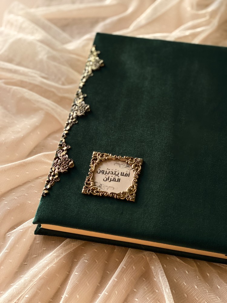 مُصحَف كبير جدا (٣٤*٢٤سم) مُغلف يدوياً بقُماش مخملي مُزين باكسسوارات مَعدنية مُميزة - يُمكن كِتابة اسم/ دعاء على الغِلاف.