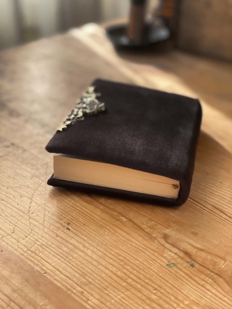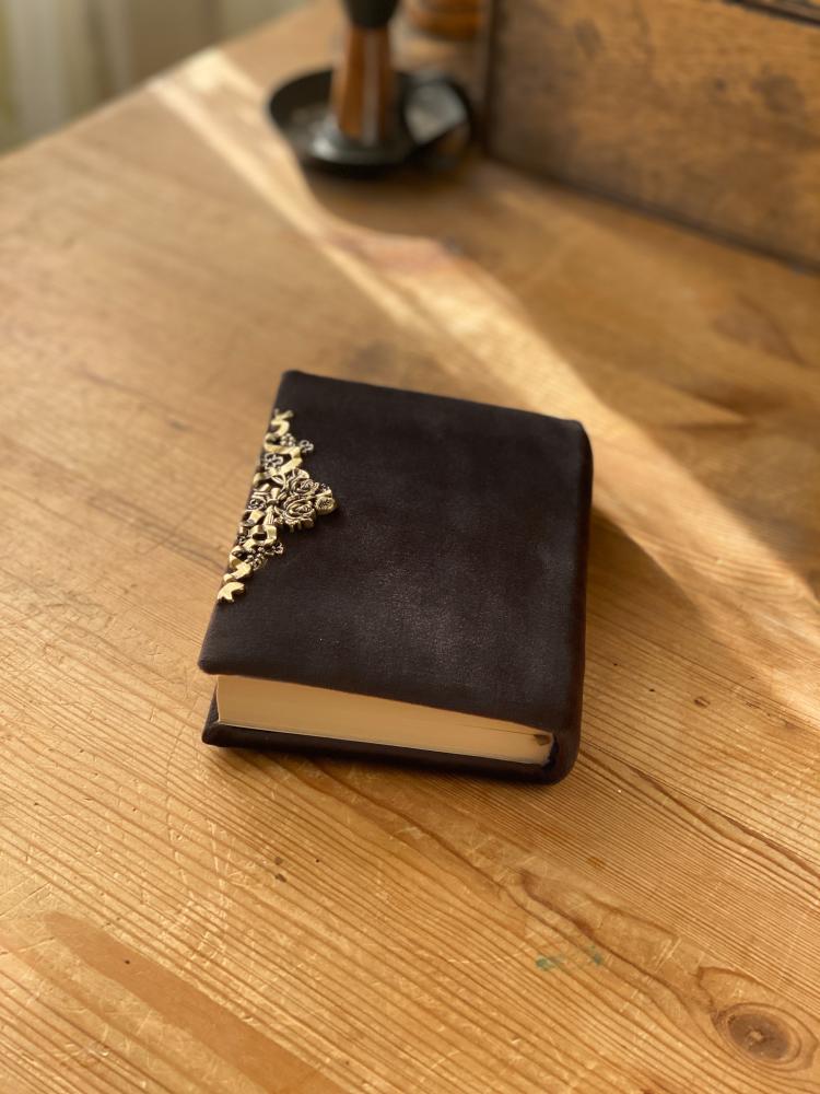 مُصحَف الثُمُن (١٤*١٠سم) مُغلف يدوياً بقُماش مخملي مُزين باكسسوارات مَعدنية مُميزة